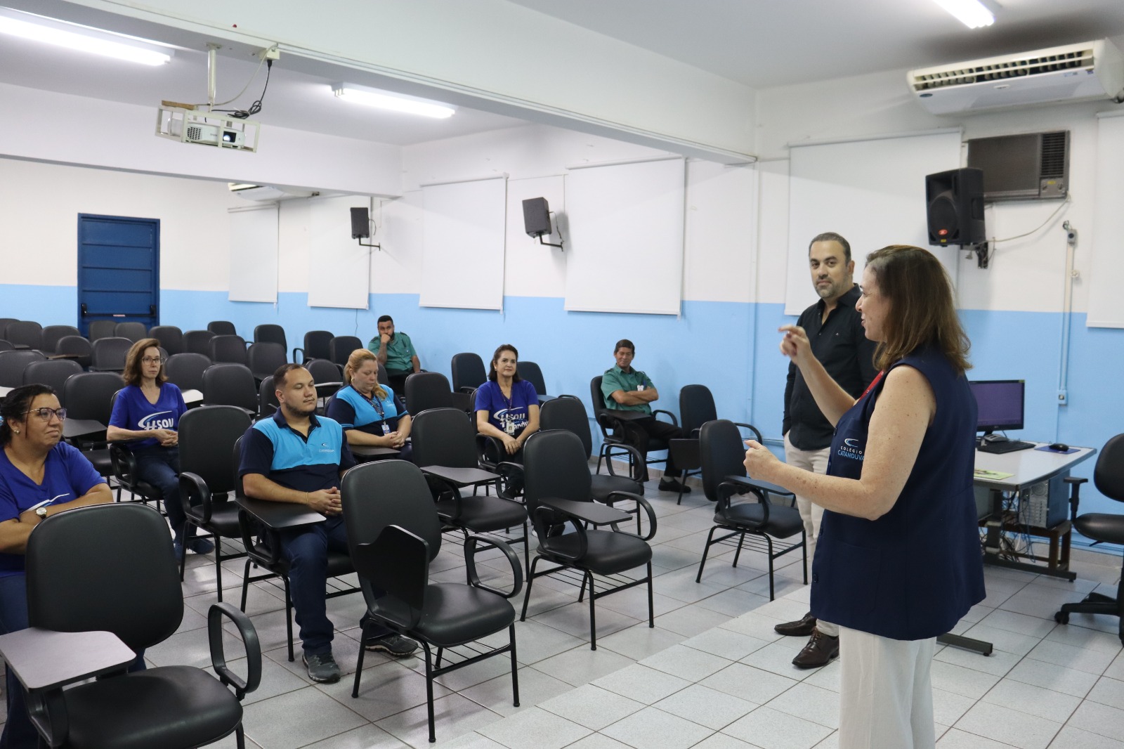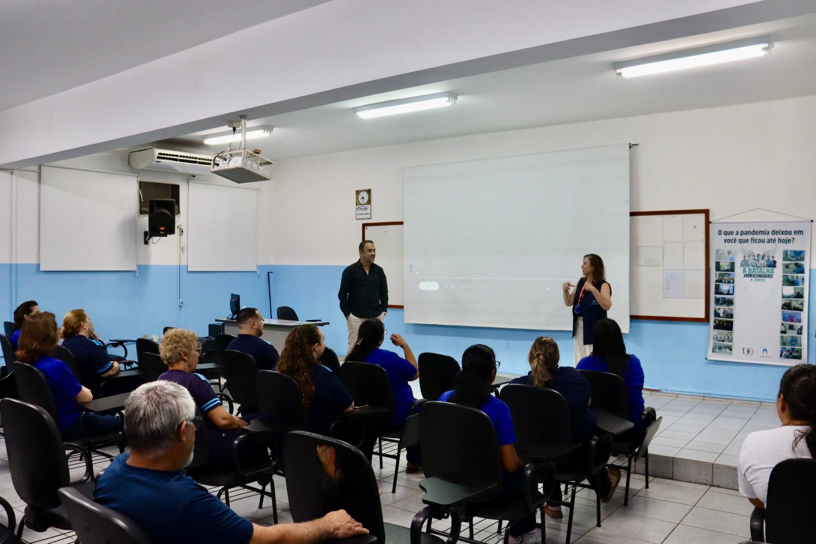 No Colégio Catanduva a programação foi realizada nesta quarta-feira (18), com ações voltadas à memória e à valorização das experiências vividas pelos profissionais durante a fase mais crítica da crise sanitária. Entre as atividades, exibição de vídeo em homenagem com depoimentos, exposição de imagens com a proposta reflexiva “O que a pandemia deixou em você que ficou até hoje?” e a mostra Memória da Batalha, que reuniu equipamentos de proteção individual (EPIs) utilizados à época.